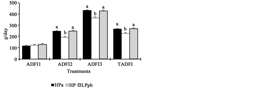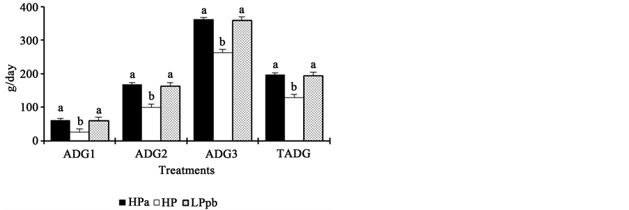 Figure 2. Effects of dietary protein levels and probiotics on the performance of newly weaned piglets. HPa: high-protein diet with antibiotics; HP: high-protein diet without antibiotics; LPpb: low- protein diet without antibiotics and with probiotics; ab: bars with different letters show statistical differences; ADG1: average daily gain in week 1; ADG2: average daily gain in week 2; ADG3: average daily gain in week 3; TADG: average daily gain during the total experimental period; ADFI1: average daily feed intake in week 1; ADFI2: average daily feed intake in week 2; ADFI3: average daily feed intake in week 3; TAFI: average daily feed intake during the total experimental period; G:F1: gain:feed ratio in week 1; G:F2: gain:feed ratio in week 2; G:F3: gain:feed ratio in week 3; TG:F: total gain:feed ratio.