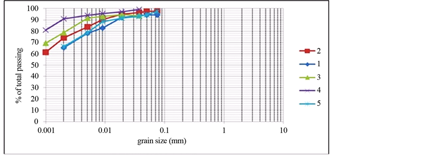 To determine the percentages of different sizes (ASTM D422) [11] consisting of the sample through sieve analysis for seize parts on sieve No. 200 (75 µm) and grain size analysis was done to use scale gravity hydrometer for the parts passing sieve No. 200 (75 µm). The standard minimum passing through the sieve was 96.26% and the determined values was 100% illustrated in Table 3. This experience in determining the ratios of different sizes that soil consist and foremost of which is the proportion of sand and materials clay and other materials as well as draw a gradient curve as in Figure 2.