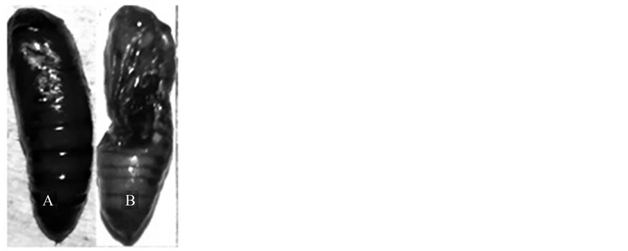 Figure 3. Pupae of S. frugiperda. (A) View of normal pupae; (B) Deformed pupae showing deficient melanization and malformation in wings, legs and antenna cover (molvizarin-3 OAc).