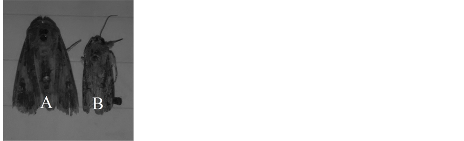 Figure 4. Adults of S. frugiperda. (A) View of untreated adult; (B) Treated adult (squamocin-3 OAc) showing malformation of wings and legs.