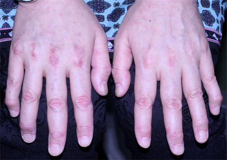 Figure 2. Erythematous lesions on radiodorsal aspects of the proximal interphalangeal and metacarpophalangeal joints.