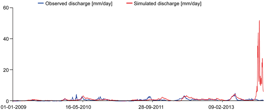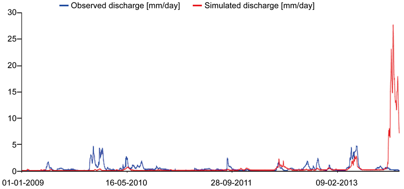The validation period for the two sub-catchments was done for the period between 1st January, 2009 to 30th November, 2013 and the results indicated better efficiencies as compared to the calibration as shown by the hydrographs in Figure 5 and Table 2.
