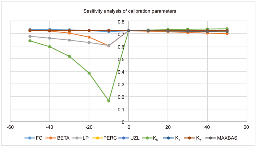 From the sensitivity analysis, the results show that the coefficient of storage K0 was the most sensitive of all the calibration parameters. The results show that a slight change of this value gives a great variation in the model performance. The LP, BETA and FC are also sensitive in that order. Other parameters such as UZL, K1 and K2 show very low sensitivity to the model performance.