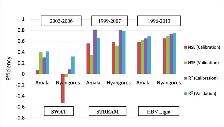 Figure 7 shows that the HBV Light model performed better in comparison to either SWAT or STREAM Model in simulating the hydrograph of the Nyangores and Amala Rivers. However, the STREAM model had a higher R2 efficiency both at the calibration and validation as compared to HBV.