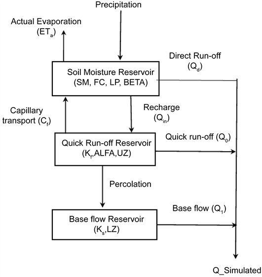 where; P is precipitation, E is evaporation, Q is runoff, SP is the snow pack, and SM is the soil moisture. The UZ and LZ are the upper and lower ground water zones.
