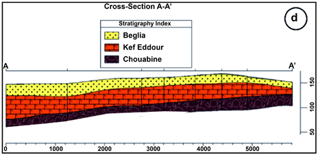 Concerning the Kef Eddour carbonates formation (Upper member of the Metlaoui group), the upper unit is marked by two thick carbonate bars comprised of colossal amounts of bioclastic dolomitic limestone with phosphorite intercalations, recognised in this mining industry as the “phosphate du toit” [61]. The Kef Eddour Formation show an average thickness of 40 m. The thickness is more noticeable towards the west (Figure 6(b) and Figure 6(c)).