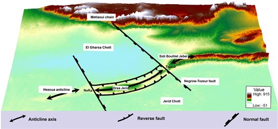 Therefore, the Nefta-Tozeur area appears as an isolated structure, limited by two reverse E-W faults on the northern and southern sides and two normal NW-SE faults on the eastern and western sides (Figure 4).