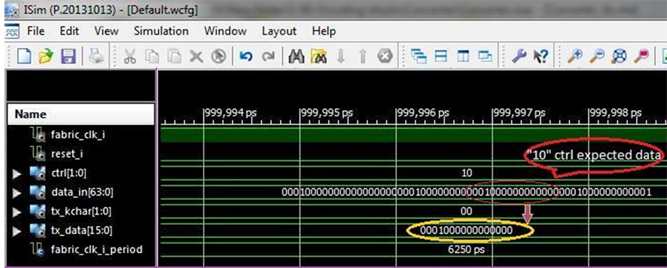 For the second component, that is the Multiplexing component which takes its input data from the ZS at a rate of 40 MHz/25ns clock cycle, the output depends on the control signal (ctrl). Four control signals have been used. The first ctrl signal of “00” gives the first 16 bits of the data string, the same output happens for the second, third and fourth ctrl signals; i.e. “01”, “10” and “11”. Figure 6 shows the simulation of this component in case of “10” ctrl. As one notices, the result of the simulation is as had been expected (encircled in the figure).