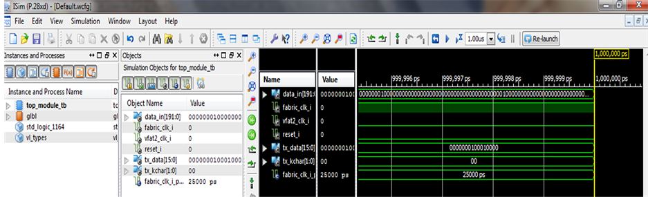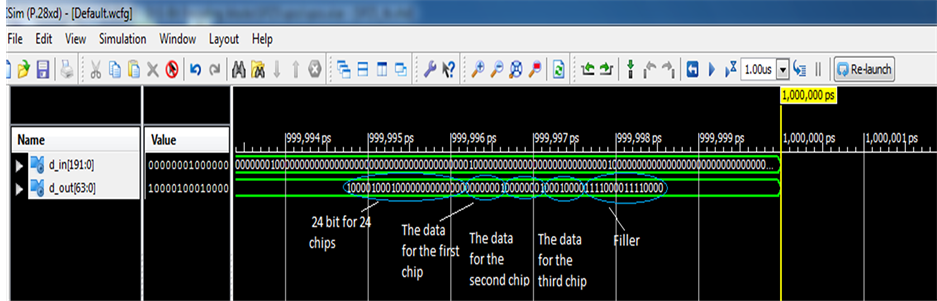 That has been done using ISim simulator that let’s you perform functional (behavioral) and timing simulations for VHDL, Verilog, and mixed-language designs. So for the first component, that is the ZS, the simulation results are shown in Figure 5 as has been expected. As an example, consider the case of three chips under hit; the output result is found to be 24 bits for the 24 chips on the DEB followed by 8 bits of data (for each chip). So in our example, the output will be 24 + 8 + 8 + 8 = 48 bits. To output 64 bits, the rest will be filled with 16 bits as filler. This is in consistence of the results that has been taken from the simulator.