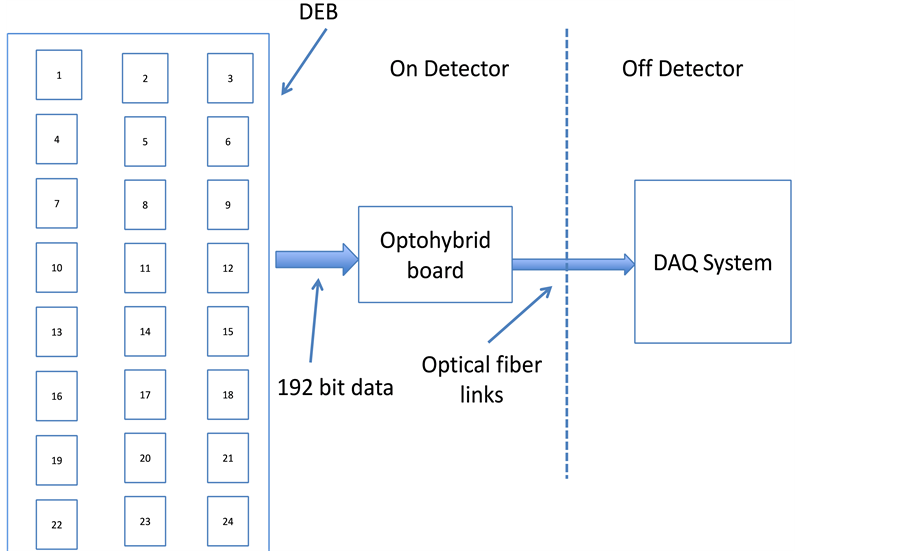 The above figure shows the process of collecting the output digital signals data from the front-end electronic boards, reducing data size, identifying which chip has hit and changing data size to adapt the chosen optical fiber.