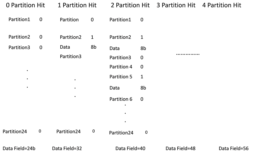 are contained within the data field. Then, a sequence of partition bits arrives to identify which partition contains data.