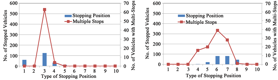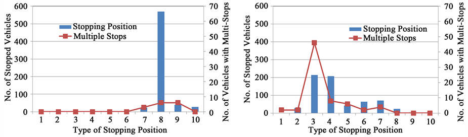 The distributions of vehicle stops in terms of the ten types of positions were illustrated in Figure 4.