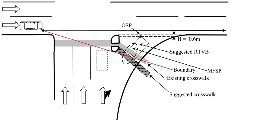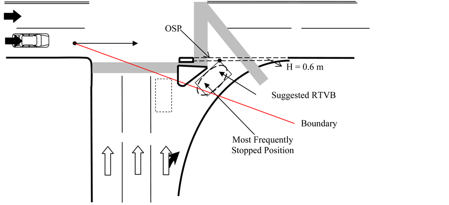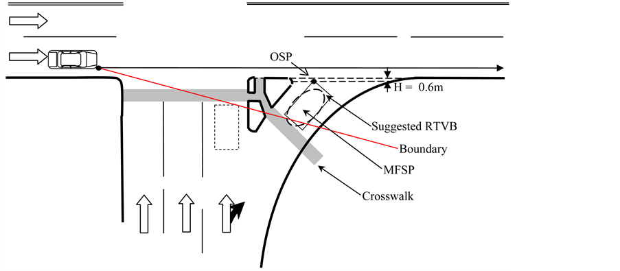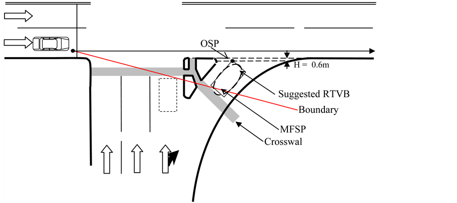 Step 1: Find out the edge of the crossing road the right-turn vehicle tends to enter; draw a safety boundary line using a recommended safe distance H (in AASHTO Green Book (15), H = 0.6 m);