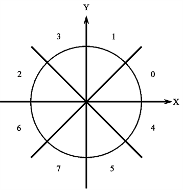 where |gradx| and |grady| are the absolute values of X-gradient and Y-gradient. When we need only 8 bins result that distributes over 0 to 360 degrees, the orientation calculation can be approximated as the following formula: