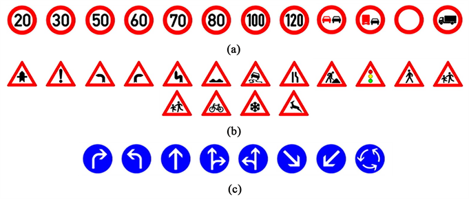 Figure 8. Traffic sign classes and the major classes of GTSDB. (a) Prohibitory; (b) Danger; (c) Mandatory.