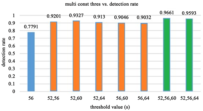 The threshold value in the color segmentation procedure can influence the detection rate. We choose multiple thresholds to overcome the variation of weather and lighting conditions. According to Figure 8, we find that using three thresholds performs the better result. However, the improvement is negligible when using more than three thresholds. The disadvantage of multiple thresholds is that the CCL needs more computing time to process multiple images, as well as more potential signs generated. Overall, we select three thresholds to reach the detection rate of 96.61% in this work.