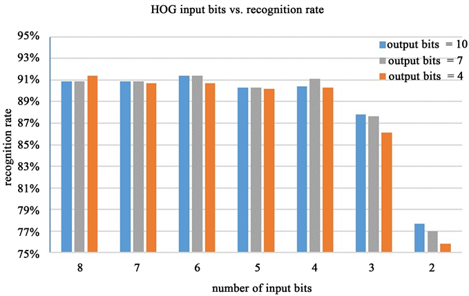 Figure 9. The influence of reducing HOG input bits vs. recognition rate.
