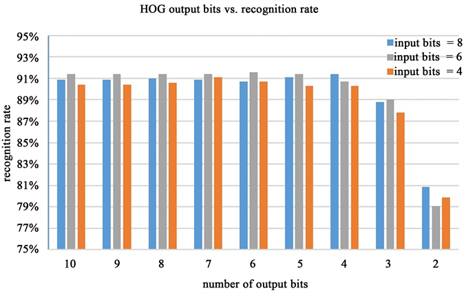 Figure 10. The influence of reducing HOG output bits vs. recognition rate.