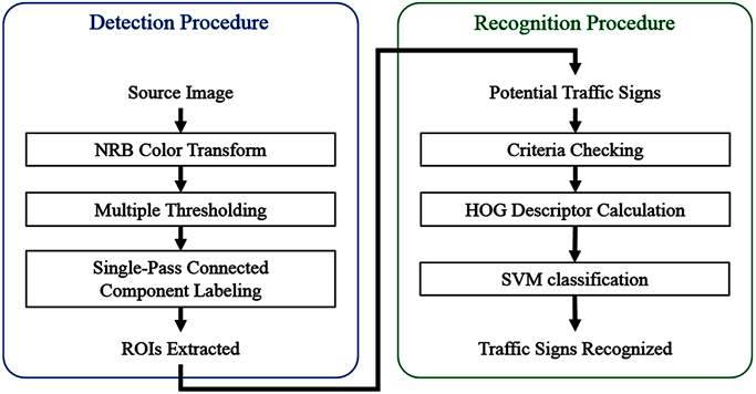 We propose the hybrid traffic sign recognition method. The method contains two main stages, detection and recognition. In the detection stage, we use Normalized RGB color transform and Single-Pass Connected Component Labeling (CCL) to find the potential traffic signs. In the recognition stage, Histogram of Oriented Gradient (HOG) is used to generate the descriptor of the signs, and we classify the signs with Support Vector Machine (SVM). The overall flow chart of main TSR procedures is shown in Figure 1. We describe the procedures in detail in the following subsections.