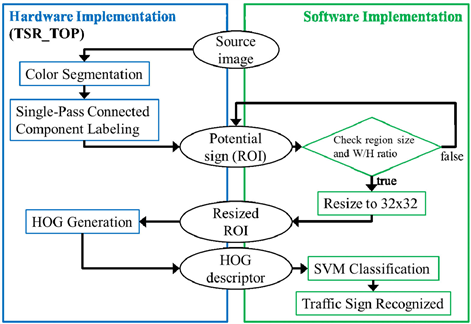 In this section, we describe the hardware architecture of the proposed TSR method. The hardware design should implement the most critical part of the TSR method. There are two aspects of the critical part should be considered. The first is the procedure that requires the most time to process, which is timing critical. The second is the procedure that requires the most computing resource, which means resource critical. Therefore, we decide to implement the detection procedure and the HOG calculation of recognition procedure in hardware. There are some relatively simple procedures like SVM prediction and image resizing. We use software implementation on those procedures. Figure 11 shows the hardware/software combination flow of the proposed TSR method. The source image first inputs to the hardware color segmentation unit, pixel by pixel as raster scanning. The pixels that determined as foreground or background are delivered to the single-pass CCL unit to group the connected pixels into a ROI. Next, the detected ROIs are checked with several conditions by the software procedure, and the ROIs that pass the conditions are resized to a constant size. The HOG unit generates the descriptors of resized ROIs. Finally, these descriptors are classified by software SVM procedure, and the traffic sign recognition is done.