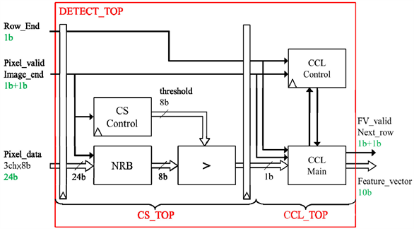 The top module for TSR contains two independent main modules, detection module and recognition module. The input data of detection module is the source image. The output is the region information of potential signs (or ROIs). In fact, the information is the feature vector of ROIs. The detection module contains two sub-modules, color segmentation (CS) and connected component labeling (CCL). After NRB transforming and thresholding in CS module, the color pixel reduces into 1-bit value and passes to CCL module. The input of