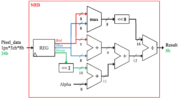1) NRB Color Transform Module: The Normalized Red/Blue color transform (NRB) module used to transform the RGB color image into red/blue enhanced image. We implement the formula shown at Equation (1). Figure 14 shows the block diagram of NRB module. For fast calculation, we implement left shifting instead of multiplication. In fact, because the shift value is constant, the shifting is wire connection in hardware. We multiply the numerator by 256 to make sure that the division result is an integer that is greater than zero.
