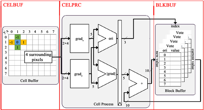 Figure 18 shows the block diagram and data flow of cell buffer, cell process unit and block buffer. The cell buffer is a 64 entries array storing ROI pixel values. The block buffer contains 4 voting tables. Each table is indexed by the gradient orientation and accumulates the gradient magnitude. The cell process unit contains several function units, and divides into two-stage pipeline for better performance. We implement the gradient unit with Equation (2), the gradient absolute unit with Equation (3) and the orientation unit with Equation (4).
