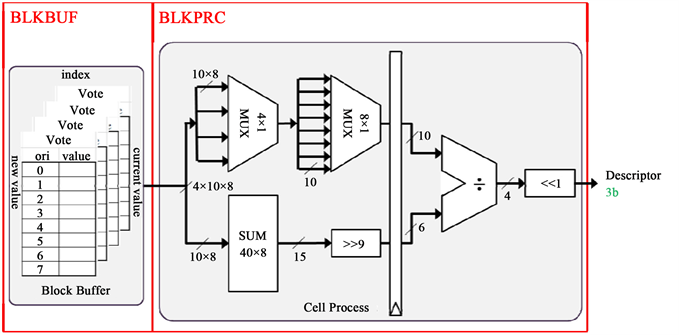 Figure 19 shows the block diagram and data flow of block buffer and block process unit. The block process unit calculates the arithmetic mean of a descriptor element across all four cells in the block. Then, the descriptor output is reduced to 3-bit width. We divide the block process unit into two-stage pipeline.