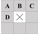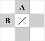 Figure 4. The adjacent pixels of (a) 4-connectivity; (b) 8-connectivity. The central pixel is marked as × and the adjacent pixels are gray. The pixels with letters are the ones that should be checked while scanning the image.