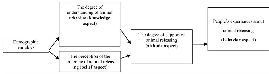 The aim of this study was to propose and validate “a great variety of animals may be released” and “attitudes toward animal releasing”. To achieve this goal, the self-developed Likert-typed questionnaire and demographic data were adapted. The demographic data collected from both stages were analyzed. Only the beliefs, knowledge, attitudes, and behaviors of the participants from the first stage were examined. Regression and path analysis were done for the data from both stages. The questionnaire research was divided into two stages. At the first stage, the questionnaire was answered by people from schools or private businesses in the northern, middle, and southern parts of Taiwan. A total of 1225 valid questionnaires were collected, among which only 9.3% of the participants were found to have ever joined animal releasing activities. At the second stage, the participants were chosen from the religious groups in northern Taiwan that offered animal releasing activities. A total of 151 valid questionnaires were collected. By the regression analysis of demographic data and beliefs of animal releasing, the result shows that “the experience of participating in religious ceremony to be one of the groups” is the strongest predictor; the “participants gender” and “their mother’s religions” influence knowledge of animal releasing most. The beliefs of animal releasing can account for much of attitudes than knowledge variables can do. “Beliefs of animal releasing” is more important than “significant others’ support” and “significant others’ support” is more important than “knowledge of animal releasing.” The main findings of the correlation among beliefs, knowledge, attitudes, and behaviors of animal releasing include the following: 1) through attitude, beliefs mediate behaviors; 2) through attitude, knowledge mediate behaviors; 3) knowledge influences behaviors directly; 4) attitude influences behaviors directly.