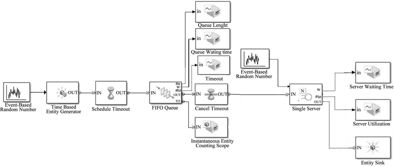 After the IN port, it will block binding Cancel Timeout cancels an expiration event name as the block timing schedule previously provided to the entity arrival. It allows us to limit the time that the entity passes along the paths of the entity designated in the simulation. This means it blocks one end of a path of an entity that is relevant for the time. The possibility of canceling event timeout before they occur allows us to apply the time an entity path. After the IN port, it will link to the Single Server block which represents the firewall in our case and ports w and util are linked respectively to signal scope server utilization which shows the curve using the server, the server waiting time which shows the latency server, port t is related to the block Event-Based Random Number, by the mean value is equal to the average value of E[S]. After the IN port, it will link to the Entity Sink block which provides a way to end a path entity.