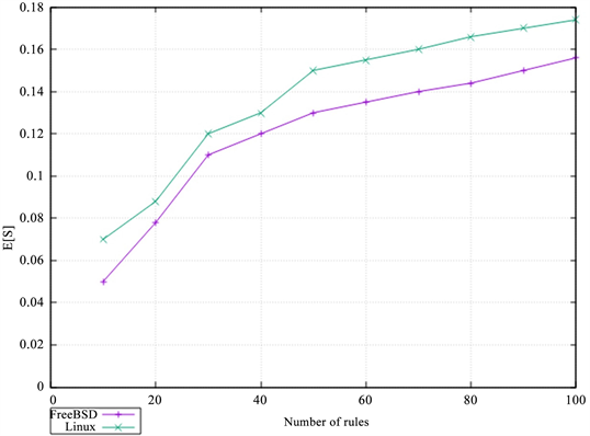 Figure 4 shows that FreeBSD and Linux using TCP, the average service time request protocol for E[S] as a function of the number of rules slowed gradually as the function of the rules increases. This can be explained by the slowdown in service time caused by the increase in number of rules caused by the increase in access to the rules of the firewall time.