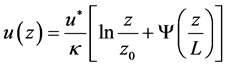 where u* is the friction velocity, κ ≈ 0.4 is the von Karman constant, z0 is the surface roughness, Ψ is an empirical function and L is the Monin-Obukhov stability parameter. Function Ψ is the correction to the logarithmic wind profile resulting from the deviation from neutral stratification. Under neutral atmospheric stability conditions, the ratio z/L tends to zero since L→∞ and, thus, Ψ drops out. Obviously, the surface roughness is one the most important parameters that affect the vertical wind velocity profile in the surface layer. Table 1 provides