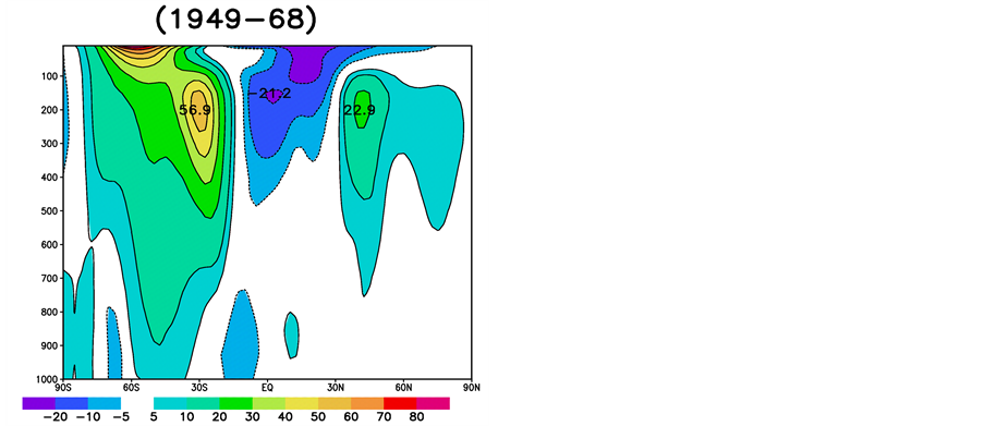 The dominant physical mechanism for generating large-scale atmospheric eddies in the high- and mid-lati- tudes is baroclinic instability of the westerly quasi-zonal atmospheric flow [34] - [36] . Atmospheric static stability and the meridional temperature gradient are the most important fundamental parameters characterizing the development of baroclinic instability and, therefore, the formation and dynamics of extratropical large-scale synoptic eddies. There is evidence of an increase over the past decades of the static stability in the extratropics [37] and a poleward movement of zones with strong MTG-baroclinic zones (e.g. [29] [38] [39] ). The MTG produces a vertical shear of the geostrophic wind that forms the westerly quasi-zonal atmospheric air jet. The speed of this flow and its vertical distribution can serve as an indicator of the meridional thermal structure of the atmosphere. Therefore the global warming can be indirectly identified through the speed and vertical shear of the westerly quasi-zonal atmospheric flow. To study how the patterns of this flow and the baroclinic instability have changed in recent decades, a comparative analysis of climates for periods 1949-1968 and 1975-1994 has been carried out using National Center for Environmental Prediction (NCEP) Reanalysis and the European Centre for Medium-Range Weather Forecasting (ECMWF) Reanalysis (ERA40) data [40] [41] . Figure 4 shows the height (in pressure units) and latitudinal cross-section of the zonal wind for the periods 1949-1968 and 1975-1994 as well their difference. One can see that there are significant differences between the two periods. Alterations in the zonal wind caused by changes in the MTG strongly affect the development of baroclinic instability, generation