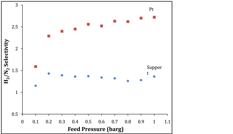 Figure 6. H2/N2 Selectivity and feed pressure relationship on support and Pt membrane @ 25˚C.