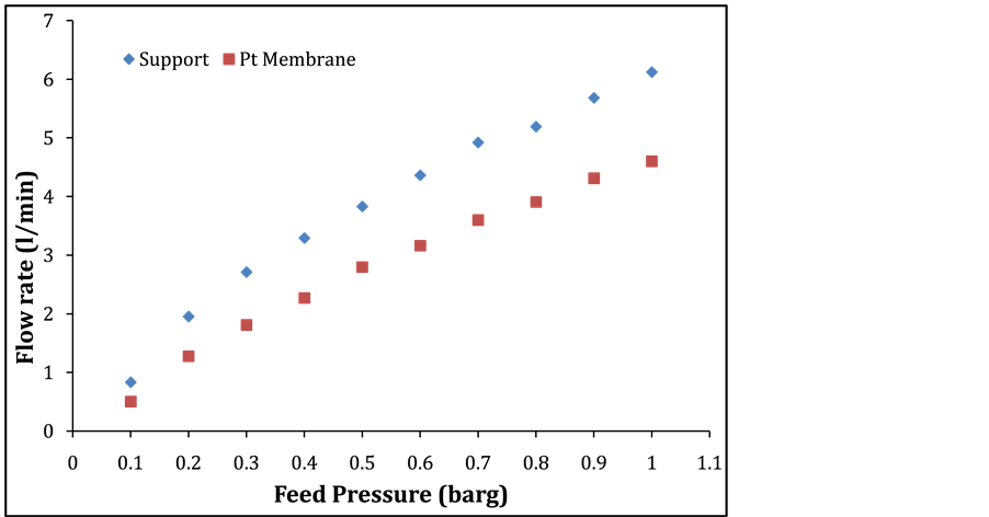 Figure 3 depicts the permeation H2 on the support and Pt membrane against feed pressure between 0.1 up to 1.0 barg. The results show a higher H2 permeation with respect to the support.