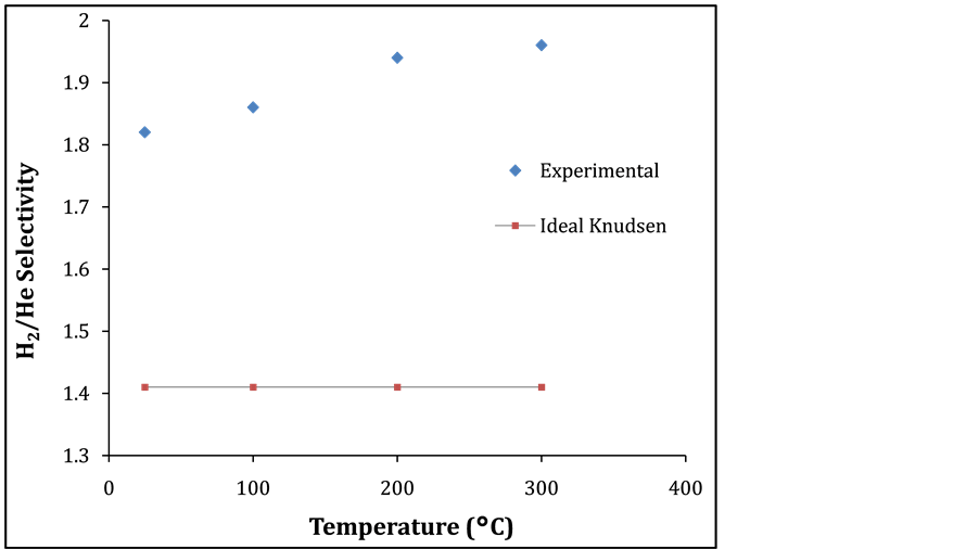 The effect of temperature on H2/He single gas selectivity with temperatures between 25˚C up to 300˚C and 1.6 barg feed pressure on Pt membrane is depicted in Figure 5. H2 selectivity of 1.96 over helium was obtained at 300˚C which is 2 fold to the theoretical knudsen selectivity. Also, an improvement of H2 selectivity is achieved as the temperature increased from 25˚C to 300˚C. Figure 6 depicts H2/N2 selectivity and feed pressure relationship on the support and Pt membrane at 25˚C. It can be seen clearly that a selectivity of 1.36 and 2.72 were obtained from the support and Pt membrane. This result corroborates with the literature [11] on silica membrane. This is a clear indication that the Pt results in an activation of the hydrogen transport to enhance the selectivity of hydrogen.