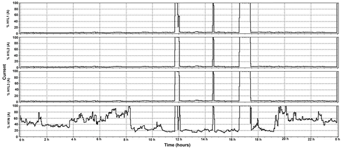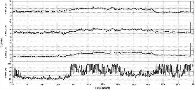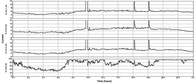 the phases between 2.4% and 7.3% followed by 16% to 99.5% in the neutral. This high rate is due to the lack of a balanced current (138 A in the neutral). The behavior of loads on this item is shown in Figure 8: