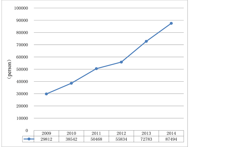 To meet the rapid development of kindergarten, the number of kindergarten teachers has rapidly increased. The number of full-time preschool teachers reached 87,494 persons in 2014 compared with 2009, and it has increased 57,682 persons and the growth of rate was 193.5% (see Figure 1).