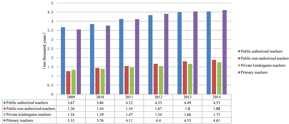 Although the kindergarten teachers’ salary is increasing year by year, there is still a big gap in terms of wages between public and private kindergartens and so is the authorized and non-authorized teachers in public kindergartens. According to incomplete survey statistics for six Cities, the teachers’ average income in private kindergarten in 2014 is 17,500 yuan that is lower than non-authorized teachers in public kindergarten, much lower than authorized teachers in public kindergarten. The difference of their salary is 27,800 yuan (see Figure 2).