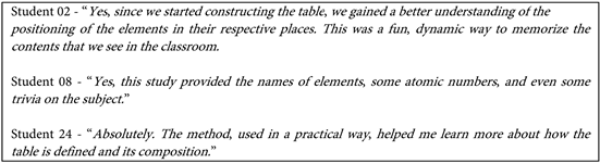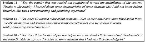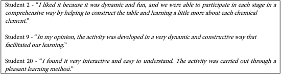In general, the responses obtained from the administered questionnaire were consistent with the observations made during the development of the activities. Thus, the provided answers were organized into categories based on the contribution of the educational activity in relation to students’ assimilation of the periodic table content, the development of the activity, and any difficulties encountered during the activities. The answers that best expressed the main idea of each category were transcribed.