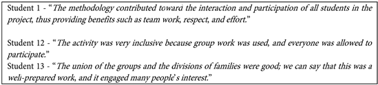 After the activities were completed, the students were provided with an open-answer questionnaire that contained three questions so that they could evaluate the educational practice that had been applied. According to Chizzotti (1995) , the questionnaire should comprise a set of questions related to the research theme in order to obtain answers from the informers on subjects regarding which they can comment or provide information. Thus, these questions sought to identify students’ learning reports, their opinions on the methodology used, and the presence of difficulties in the work execution.
