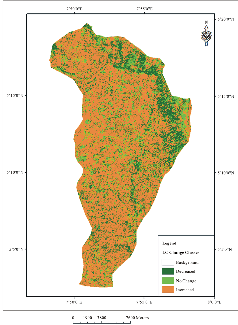 From the findings, five major land cover classes were identified in the study area. These classes are forests, se- condary forests, bush fallow, compound farmland and open water. Of these five land cover categories, bush fallow had a decrease of about 680.33 hectares with annual rate of decrease of 34.02 hectares per year. There have been significant gains in the category of compound farmlands on account of agriculture. In terms of the magnitude of change, a total of 6791.08 hectares of the area witnessed reduction while areas of increase and little change were 21,614 hectares and 3824 hectares representing 78.70 percent and 10.07 percent respectively. The land cover change result has revealed that the most stable of the land covers are the forests and open water, while secondary forest, bush fallow and compound farmland have been prone to changes. From the findings made, it was discovered that the land cover of the area has witnessed significant conversion and modification much of which were at variance with the development efforts of government. In this regard, the related government agencies should, as a matter of policy embark on data acquisition, analysis of land use and land cover