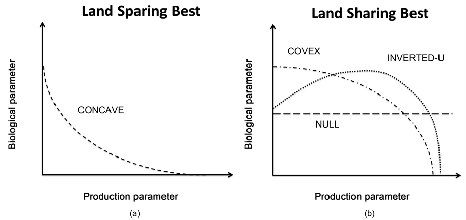 predicted to increase habitat loss. Although it is clear that potential and realized yield gap should be narrowed, many countries have decreased hunger by investing on food access, sanitation education, health and so on through local and country scale food policies. Many of the studies have compared biodiversity and agricultural production under “intensive vs. non-intensive” management and “natural habitats”. These studies assume that, depending on the species richness/abundance and yield shape, either LSP or LSH strategies will be more effective. Beyond the well-known concave and convex patterns, also U-shaped and null models are also possible. Furthermore, species responses alone are not sufficient to compare LSP and LSH efficiency, as the relationship between agriculture output, farm expansion/retraction and habitat loss is of ultimate importance. As intensification generally leads to increase habitat loss, even if species respond on a convex fashion, habitat loss and intensification may lead to population declines at both farmed and unfarmed portions, suggesting the low or even negative biological consequences of LSP management.