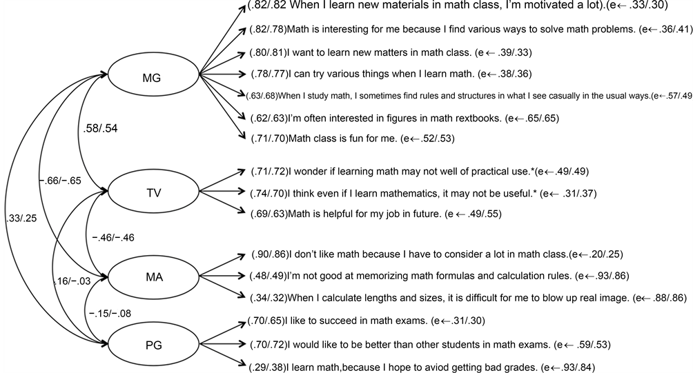 The present study is designed to develop the modified version of mathematics motivation scale by modifying Japanese version of Mathematics Motivation Scale (Oie & Fujie, 2007a, 2007b) , to explain how mastery goal, performance goal, task value, and mathematics anxiety develop through transition from elementary to junior high school. The hypothesized structure of the model was based on previous Mathematics Motivation Scale (Oie & Fujie, 2007a, 2007b) . We bring up a meaningful modification of this scale, because CFAs (confirmatory factor analysis) have not been applied in Oie and Fujie (2007a, 2007b) . The original scale was created only by utilizing EFA (explanatory factor analysis). Furthermore, in the original scale they adopted the item whose factor loading was under 0.40. It leads to this scale’s destabilization. Therefore, we decided to select items carefully by adopting the more rigorous method CFA. Although students show a decline in school motivation during adolescence on average, a subset of students shows an increase in school motivation (Eccles, 2013) . Given that researchers have shown the existence of school and age-related differences in mathematics motivation, it becomes important to determine not only if they are in effect distinct but also whether the measurement structure and the correlation between the factors are stable over development and across the transition from elementary to junior high school. This type of examination can only be accomplished using a longitudinal CFA by Vaillancourt, Brendgen, Boivin, & Tremblay (2003) .