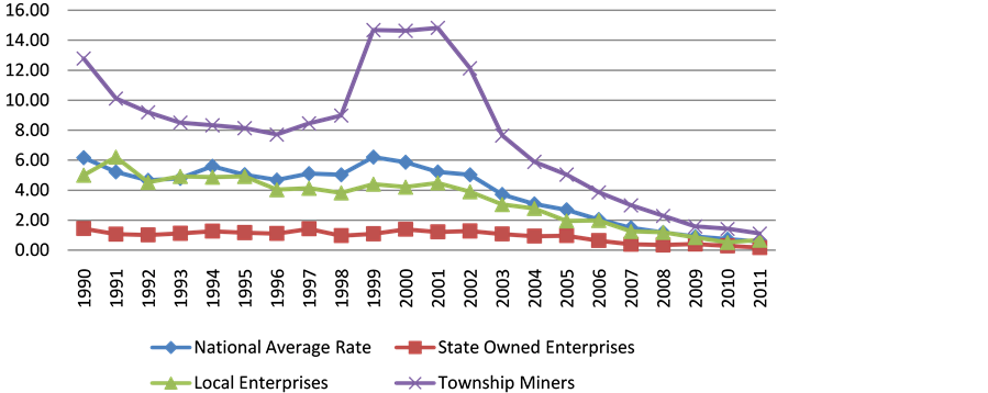 Figure 1. The mortality rates per one million tons by different ownership coal firms from 1990 to 2011 in China (%)2.