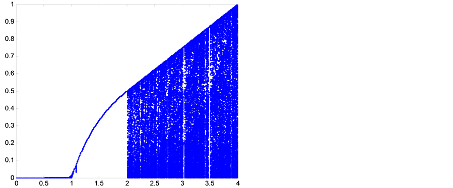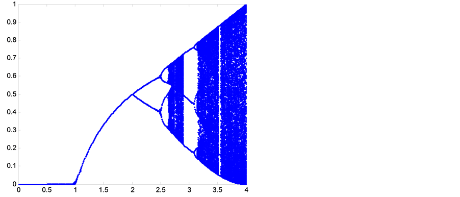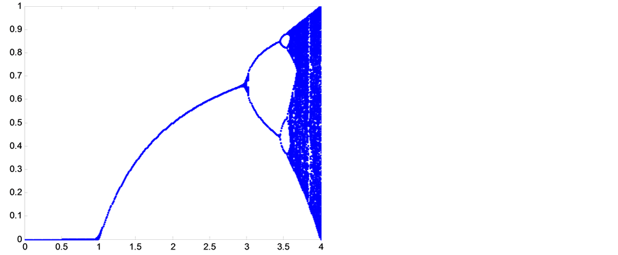 In order to view chaotic properties of Logistic map, bifurcation diagram and Lyapunov exponent of it should be calculated and plotted. Bifurcation diagram of Logistic mapwith respect to “r” are calculated and plotted in Figure 3.