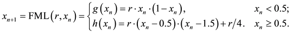 Bifurcation diagram of FML map with respect to “r” are calculated and plotted in Figure 7. Lyapunov exponent of FML map with respect to “r” are calculated and plotted in Figure 9. According to Figure 7 and Figure 8, FML map is chaotic when parameter “r” lies in intervals [2.6, 2.9] or [3.2, 4].
