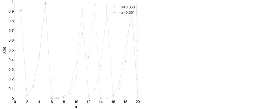 Figure 2. Orbit diagrams of logistic map with respect to two initial conditions 0.350 and 0.351 (r = 4).