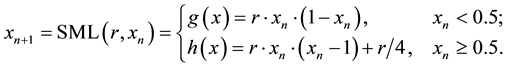 initial condition is not suitable. However, FML map is chaotic when parameter “r” lies in intervals [2.6, 2.9] or [3.2, 4] according to the graphs of bifurcation diagram and Lyapunov exponent. To define a second versionmodified Logistic map, we found vertical and horizontal symmetry of its first segment and transformed the result to right. Recursive equation of Second Modified Logistic (SML) map is forming. Sensitivity of SML map to initial condition is observed in the figure. There is superior sensitivity to initial condition. According to Figure 11 and Figure 12, SML map is chaotic when parameter “r” lies in intervals [2, 4].